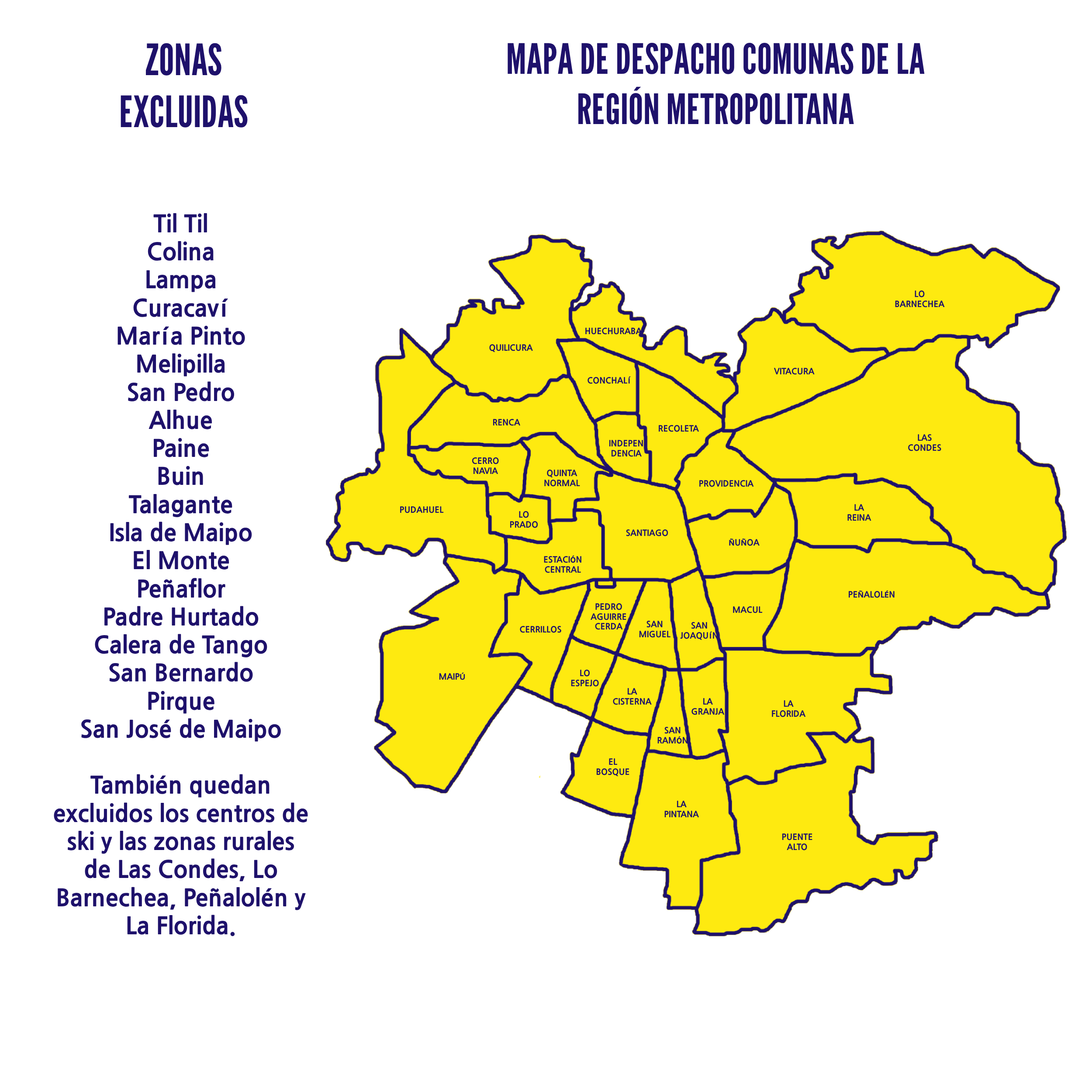 Comercial Larrain pone a disposición de sus clientes web despacho con cobro en el radio urbano de las siguientes comunas de la Región Metropolitana incluidas en el mapa adjunto, así mismo pone a disposición envío gratuito en estas mismas comunas por compras sobre $150.000.
